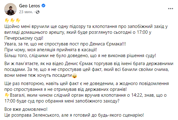 "Речь о видео, на котором Денис Ермак торговал от имени брата государственными должностями. За то, что я не опроверг этот факт, который все видели воочию, они меня тоже хотят посадить", - добавил Лерос.
