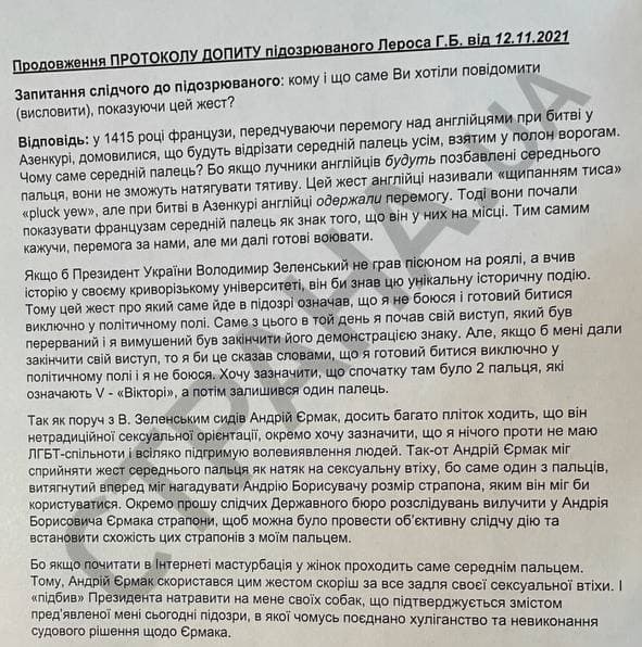 В распоряжении "Страны" оказался протокол допроса депутата Гео Лероса, в котором изложены показания нардепа, в частности ответ Лероса на вопрос следователя "кому и что именно вы хотели показать, демонстрируя этот жест?"