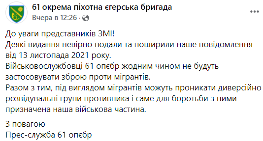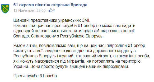 Скандал возник после того, как Facebook-аккаунт "61-й отдельной пехотной егерской бригады" заявил, что, если "так называемые мигранты" попробуют попасть из Беларуси в Украину, они "будут уничтожены".