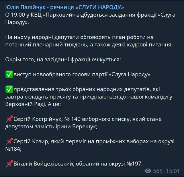 Об этом сообщает пресс-секретарь фракции "Слуга народа" Юлия Палийчук в Tелеграм-канале.