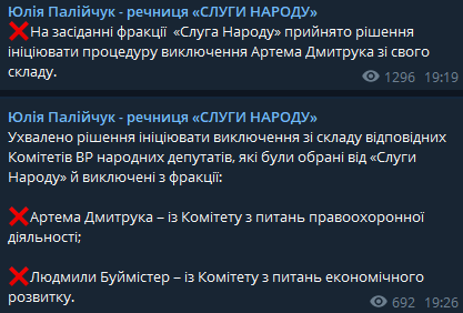 В последние месяцы Дмитрук голосует не с линией партии, а недавно вошёл в объединение экс-спикера парламента Дмитрия Разумкова. В связи с этим его исключение прогнозировалось и ранее. Кроме этого, в ходе заседания приняли решение инициировать исключение из состава комитета по экономическому развитию ранее исключенную из фракции "Слуга народа" Людмилу Буймистер.