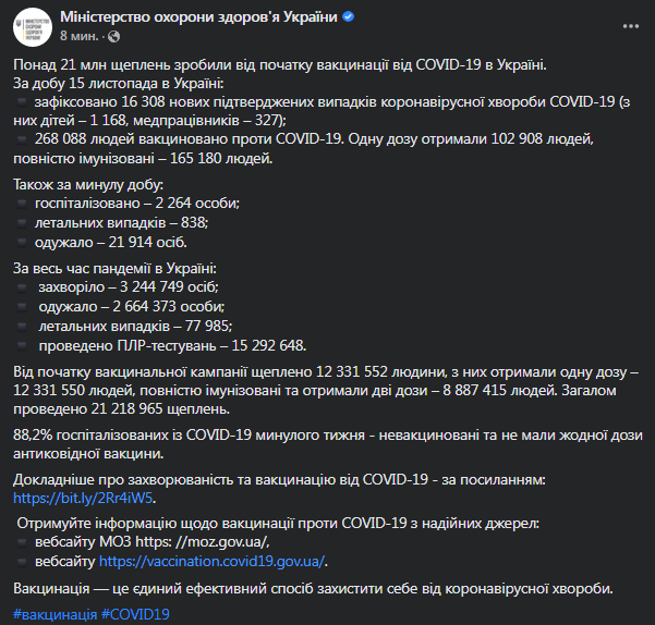 За прошлые сутки, 15 ноября, в Украине коронавирус обнаружили у 16 308 человек. Среди новых заболевших 1 168 детей и 327 медиков. В больницы попали  2 264 пациента с ковидом. 838 человек умерли, 21 914 - выздоровели.