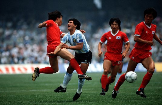 3. Игрок Южной Кореи делает очень больно Диего Марадоне в матче Кубка мира-1986.
