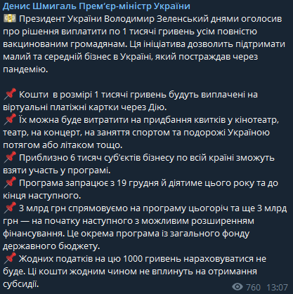 Средства в размере 1 тысячи гривен будут выплачены на виртуальные платежные карты через приложение "Дия".