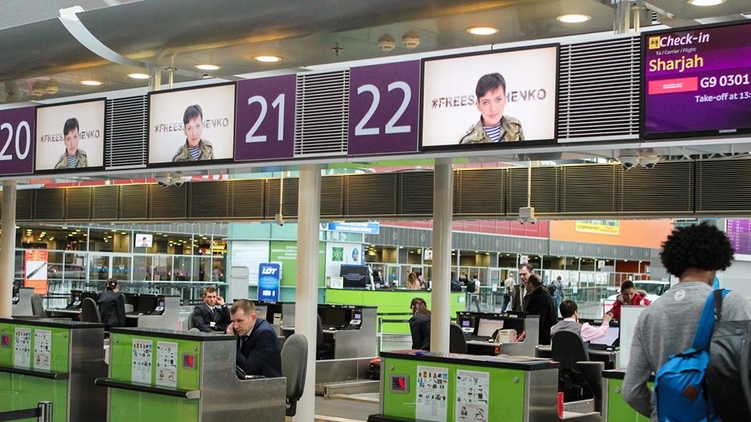 В международном аэропорту "Борисполь" на всех экранах, расположенных в здании аэроузла, появилось изображение украинской летчицы Надежды Савченко.
