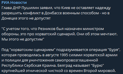 "С учетом того, что Резников был назначен министром обороны, это про хорватский сценарий. Они об этом мечтают. Мы этого не допустим", - приводит агентство слова Пушилина.
