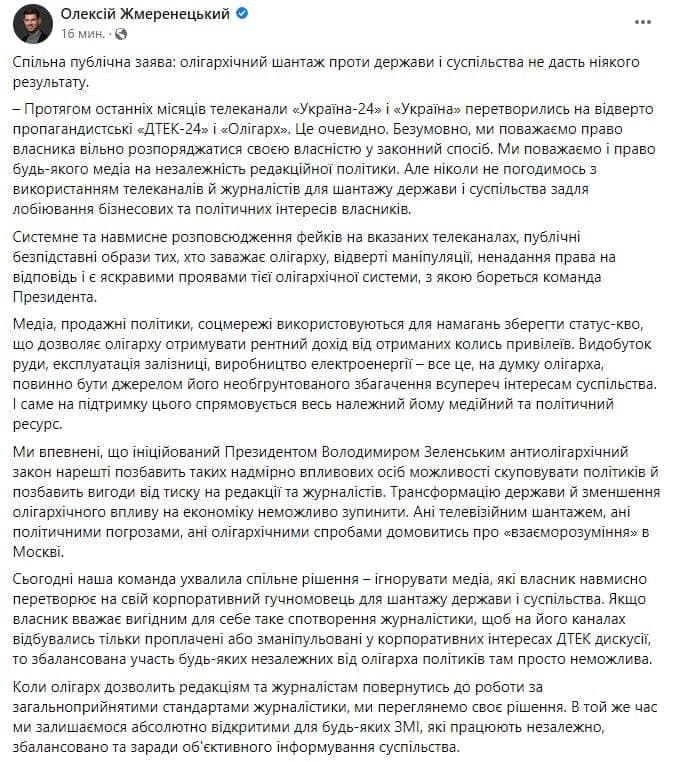 "В последние месяцы телеканалы "Украина-24" и "Украина" превратились в откровенно пропагандистские "ДТЭК-24" и "Олигарх". Это очевидно. Безусловно, мы уважаем право владельца свободно распоряжаться своей собственностью законным способом. Мы уважаем и право любого медиа на независимость редакционной политики. Но никогда не согласимся с использованием телеканалов и журналистов для шантажа государства и общества для лоббирования бизнес-политических интересов собственников", - говорится в сообщении Жмеренецкого.