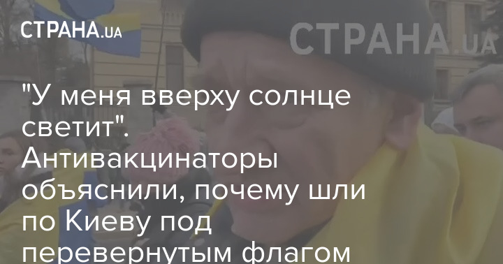 Участники марша противников вакцинации, который прошел сегодня по Киеву от Верховной Рады по бульвару Шевченко к зданию СБУ, держали в руках перевернутые флаги Украины - желтая часть вверху, а синяя внизу. Как пояснили протестующие, они считают такой флаг правильным, а вовсе не перевернутым.