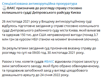 Сообщается, что коллегия судей ВАКС отказала стороне защиты в изменении меры пресечения, которая была избрана обвиняемому, и продлила меру пресечения в виде круглосуточного домашнего ареста до 24 января 2022 года.
