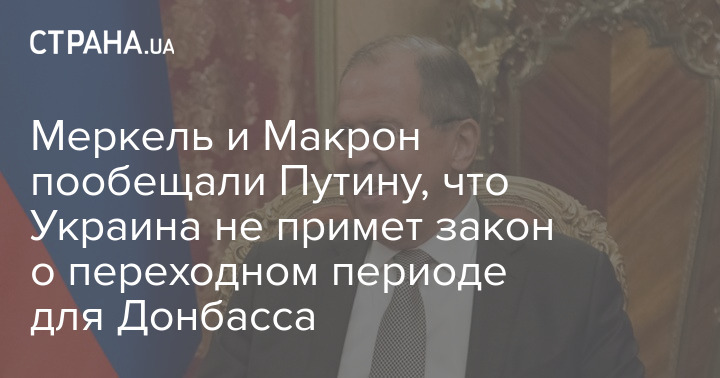 Министр иностранных дел РФ Сергей Лавров заявил, что канцлер Германии Ангела Меркель и президент Франции Эммануэль Макрон пообещали России, что Украина не примет закон о переходном периоде для Донбасса.