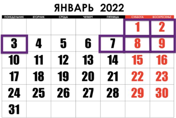 На Рождество также три выходных дня: 7 января (пятница), 8 января (суббота), 9 января (воскресенье).