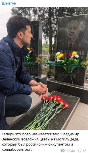 "Теперь это фото называется так: "Владимир Зеленский возложил цветы на могилу деда, который был российским оккупантом и коллаборантом", - придумали новую подпись известного снимка президента Зеленского на могиле Семена Зеленского в Telegram-канале "Шептун".