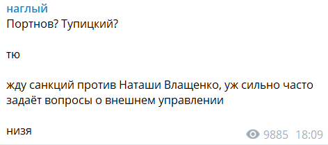 Жду санкций против Наташи Влащенко, уж сильно часто задаёт вопросы о внешнем управлении. Низя", - иронизирует телеведущий Макс Назаров.