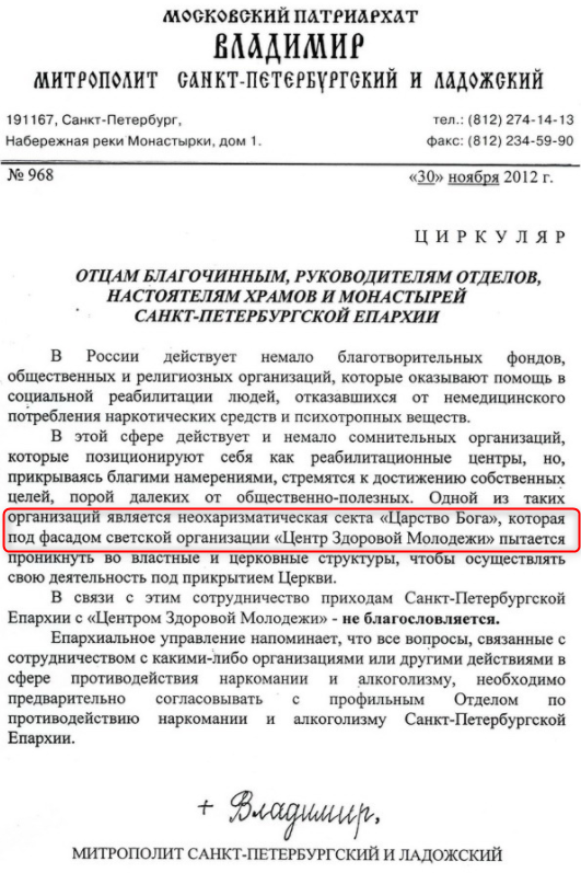 В 2012 году митрополит Санкт-Петербургский Владимир издал циркуляр, где прямо заявил, что под прикрытием "Центра здоровой молодежи" действует секта "Царство бога", поэтому сотрудничать с ним РПЦ не будет.