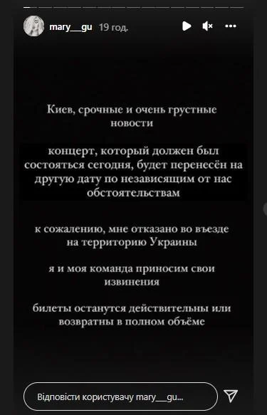"Киев, срочные и очень грустные новости. Концерт, который должен был состояться сегодня, будет перенесен на другую дату по независящим от нас обстоятельствам. К сожалению, мне отказано во въезде на территорию Украины. Я и моя команда приносим свои извинения", - написала она.