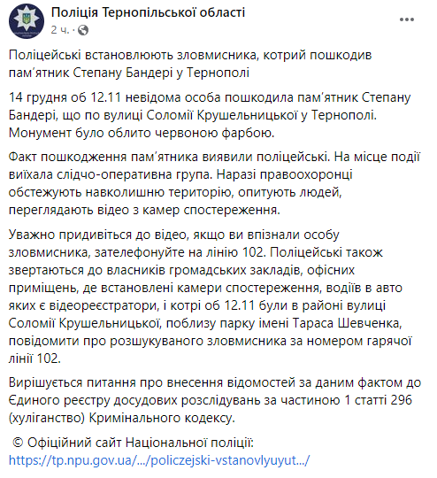 В Тернополе по улице Соломии Крушельницкой вчера, 14 декабря, полицейские обнаружили, что неизвестный облил красной краской памятник Степану Бандере. На место происшествия выехали правоохранительные органы.