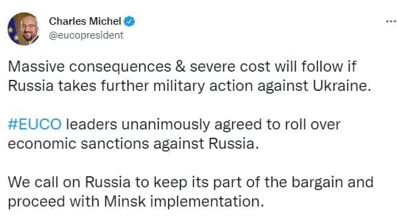 Об этом заявил глава Европейского совета Шарль Мишель в Twitter.