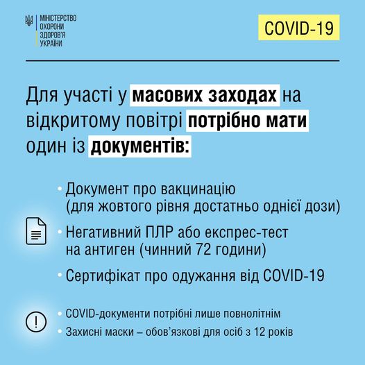 В Министерстве здравоохранения Украины заявили о том, что теперь участвовать и организовывать любые массовые мероприятия на свежем воздухе могут только люди, имеющие необходимые документы на Covid. В частности, речь идет о фестивалях, концертах, ярмарках, выставках и т.д.