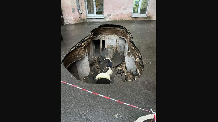 В Киеве провалился асфальт на одной из улиц. Огромная яма обнажила какие-то помещения. Как выяснилось, это подвал здания начала ХХ ст. - памятника архитектуры местного значения.
