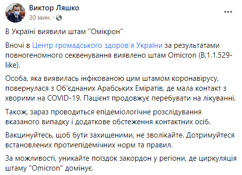 Министр здравоохранения Украины Виктор Ляшко заявил, что в Украине обнаружили штамм "Омикрон" у пациента, который ранее вернулся из ОАЭ.
