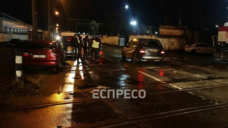 В Киеве тепловоз протаранил авто и протащил его несколько метров. Пострадали женщина и ребенок. Фото