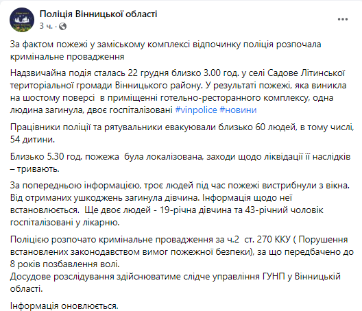 По данным правоохранителей, пожар вспыхнул на шестом этаже гостинично-ресторанного комплекса около 03:00 22 декабря. Инцидент произошел в селе Садовое Литинской территориальной громады Винницкого района.