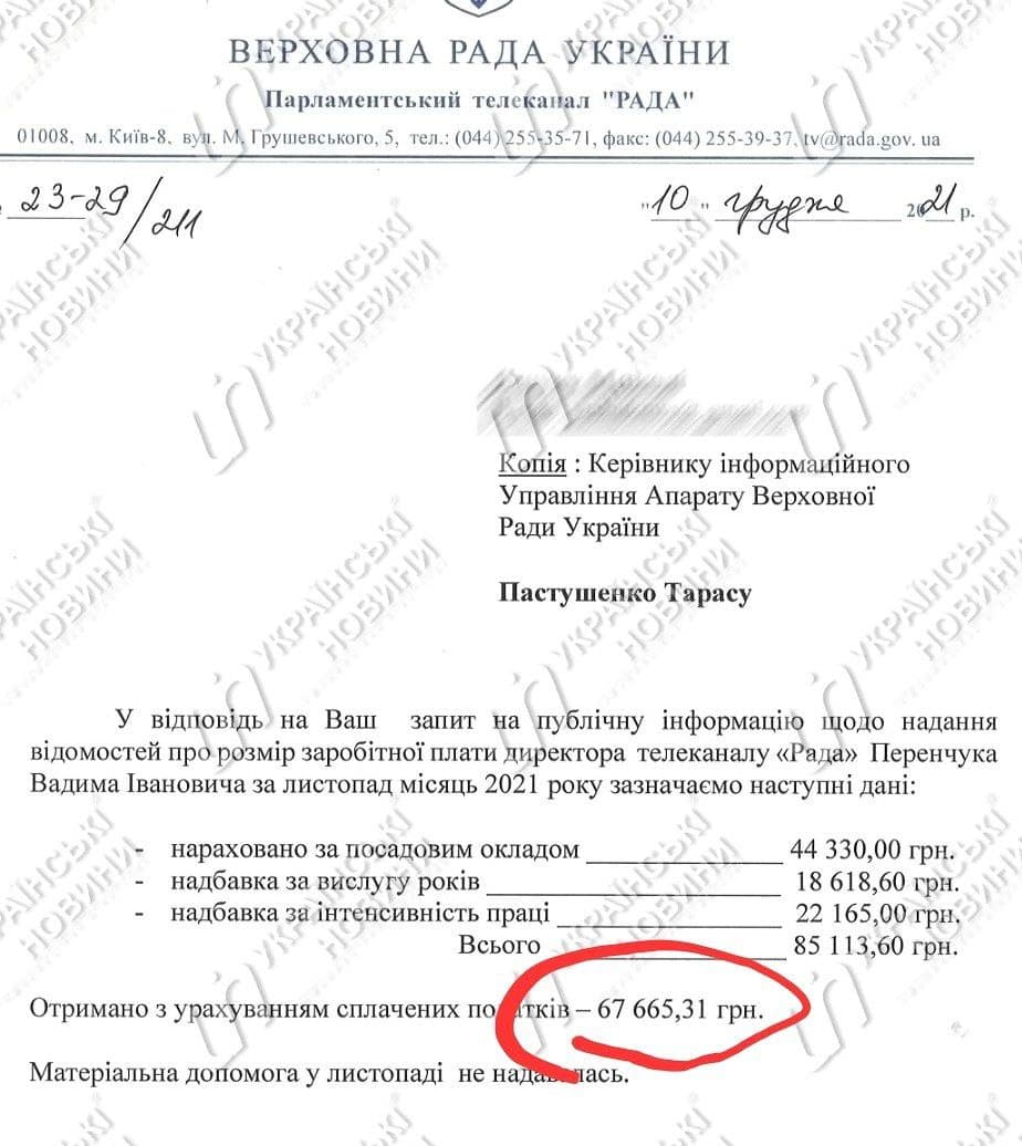 Также в ответе указано, что с учетом уплаченных налогов Перенчук получил 67 665 грн.