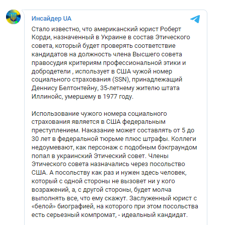 Американский юрист Роберт Корди, который назначен в Украине в состав Этического совета и будет проверять соответствие кандидатов на должность члена Высшего совета правосудия критериям профессиональной этики и добродетели, использует в США чужой номер социального страхования (SSN). Документ принадлежит 35-летнему Деннису Белтонтейну, который жил в штате Иллинойс и скончался в 1977 году.