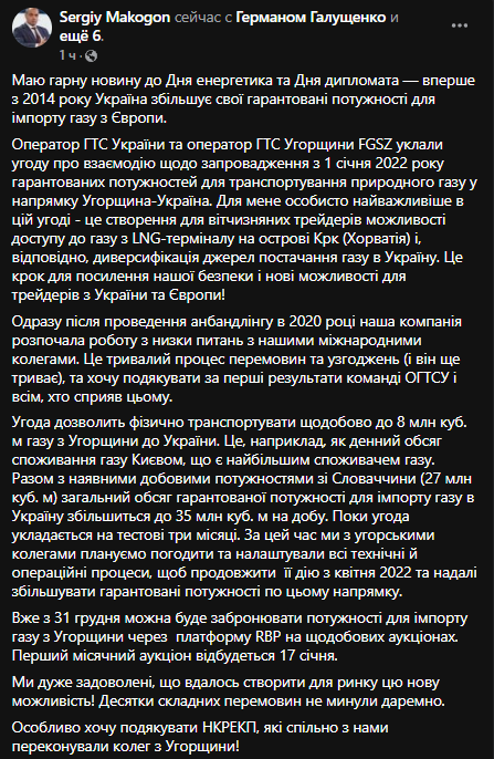 "Оператор ГТС Украины и оператор ГТС Венгрии FGSZ заключили соглашение о взаимодействии по введению с 1 января 2022 гарантированных мощностей для транспортировки природного газа в направлении Венгрия-Украина", - написал Макогон.