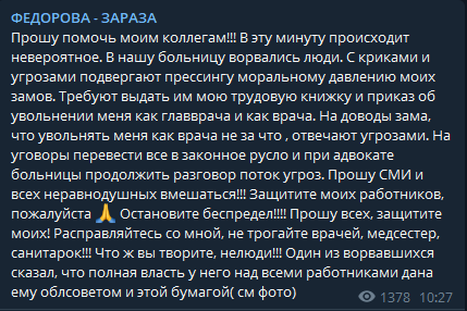 "В нашу больницу ворвались люди. С криками и угрозами подвергают прессингу моральному давлению моих замов. Требуют выдать им мою трудовую книжку и приказ об увольнении меня как главврача и как врача. На доводы зама, что увольнять меня как врача не за что , отвечают угрозами", - пишет Федорова.