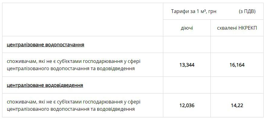 - централизованное водоснабжение - 16,164 грн/кубометр с НДС;