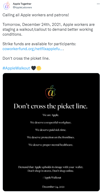 "Всем сотрудникам и клиентам Apple: 24 декабря, работники компании проведут стачку с требованием лучших условий труда", - говорится в сообщении.