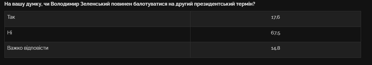 Так, 67,5% респондентов заявили, что Зеленский не должен идти на второй срок. При этом 17,6% – были противоположного мнения. Еще 14,8% не смогли ответить.