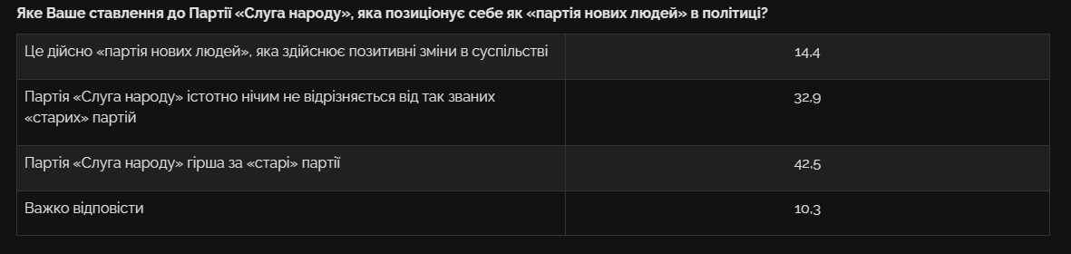 Кроме этого, 42,5% украинцев считают, что партия "Слуга народа", которая позиционирует себя как "партия новых людей", хуже "старых" партий. 33% респондентов считают, что она от них ничем не отличается и лишь 14% считают, что она осуществляет позитивные перемены.