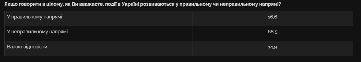 Помимо этого, 68,5% украинцев считают, что ситуация в стране движется в неправильном направлении и лишь 17% считают наоборот.
