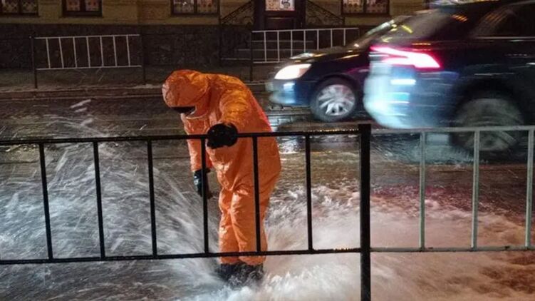 Во Львове коммунальщик час стоял на крышке люка, чтобы сдержать бьющий из-под нее семиметровый фонтан. Видео