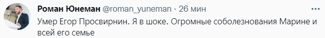 Экс-кандидат в депутаты Мосгордумы Роман Юнеман также подтвердил гибель Просвирнина: "Умер Егор Просвирнин. Я в шоке. Огромные соболезнования", - написал политик в Twitter.