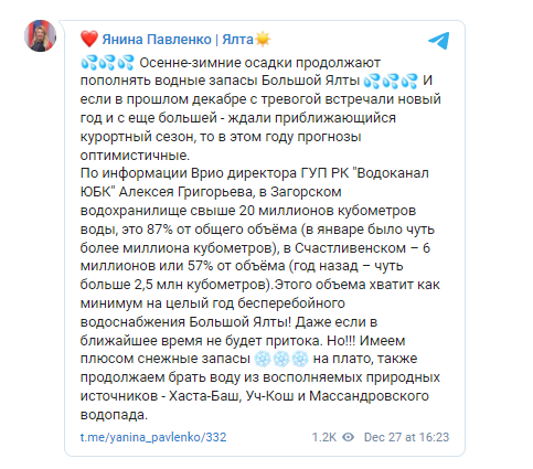"Этого объема хватит как минимум на целый год бесперебойного водоснабжения Большой Ялты! Даже если в ближайшее время не будет притока. Имеем плюсом снежные запасы на плато, также продолжаем брать воду из восполняемых природных источников - Хаста-Баш, Уч-Кош и Массандровского водопада", - добавила глава администрации.