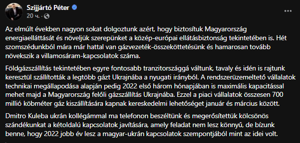 "Это даст рыночным компаниям коммерческую возможность поставить в общей сложности 700 миллионов кубометров газа в период с января по март. Мой украинский коллега Дмитрий Кулеба и я говорили сегодня по телефону и подтвердили наше обоюдное намерение улучшить двусторонние отношения - задача, которая будет непростой, но мы надеемся, что 2022 год будет лучше для венгерско-украинских отношений, чем этот год", - подытожил он.