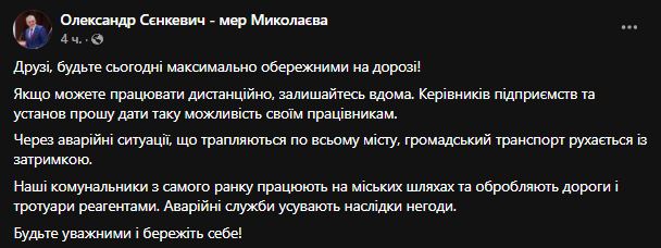 Во вторник, 28 декабря, мэр Николаева Александр Сенкевич из-за неблагоприятных погодных условий призвал всех жителей города оставаться дома, а также попросил работодателей дать возможность сотрудникам работать в удаленном режиме.
