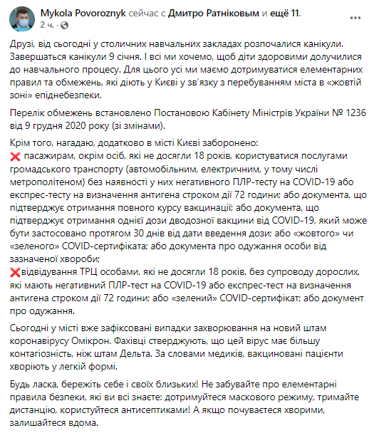 "Сегодня в городе уже зафиксированы случаи заболевания новым штамом коронавируса "Омикрон". Специалисты утверждают, что этот вирус обладает большей контагиозностью, чем штамм "Дельта". По словам медиков, вакцинированные пациенты болеют в легкой форме", - написал Николай Поворозник.