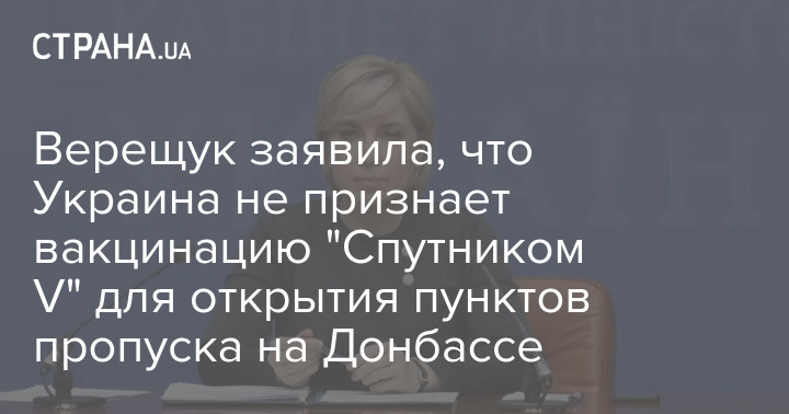 Министр по вопросам реинтеграции временно оккупированных территорий Ирина Верещук заявила, что Украина не будет признавать российскую вакцину "Спутник V", чтобы возобновилась работа контрольных пунктов въезда-выезда (КПВВ) на Донбассе со стороны "ДНР" и "ЛНР".