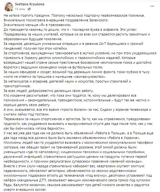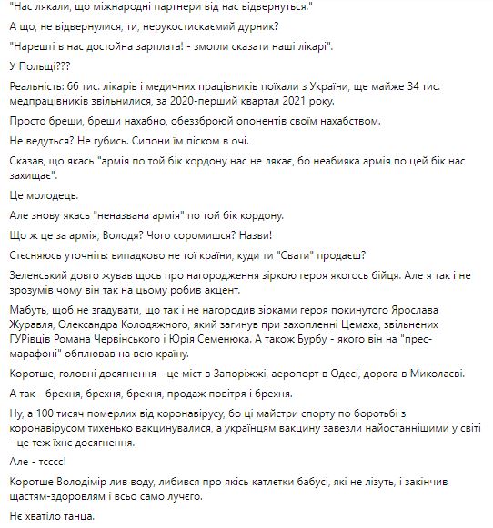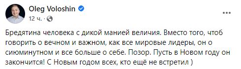 "Бредятина человека с дикой манией величия. Вместо того, чтоб говорить о вечном и важном, как все мировые лидеры, он о сиюминутном и все больше о себе. Позор. Пусть в Новом году он закончится! С Новым годом всех, кто ещё не встретил" - написал депутат от ОПЗЖ Олег Волошин.