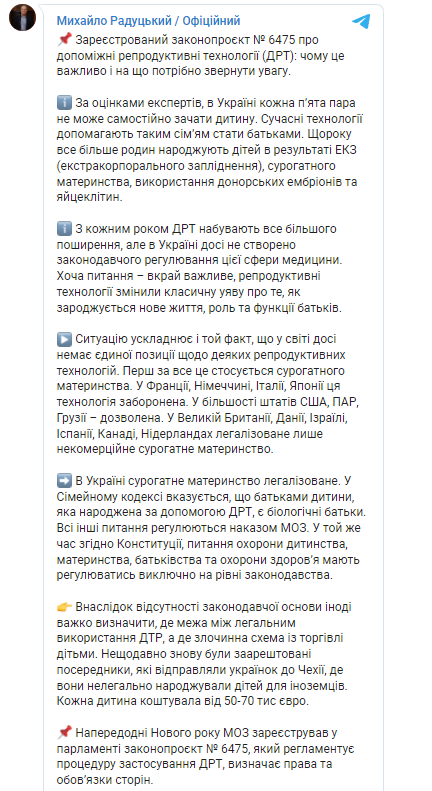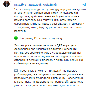 Как объяснил Радуцкий, законопроект устанавливает несколько важных положений о ВРТ: