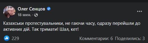 Украинский режиссер Олег Сенцов, известный по фильму "Носорог", поддержал действия протестующих в Казахстане, которые стреляют в силовиков и жгут здания. Об этом он написал на своей странице в Facebook.
