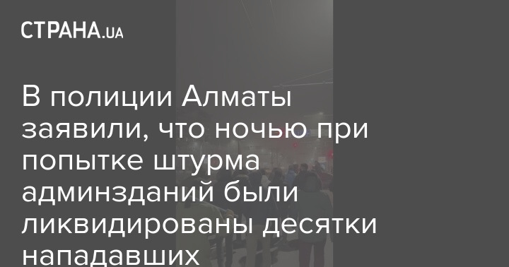 "Минувшей ночью экстремистскими силами предпринята попытка штурма административных зданий, Департамента полиции города Алматы, а также районных управлений и отделов полиции. Десятки нападавших ликвидированы, их личности идентифицируются", - сказала она в эфире телеканала "Хабар-24".