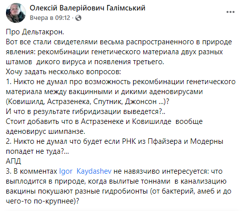 1. Никто не думал про возможность рекомбинации генетического материала между вакцинными и дикими аденовирусами (Ковишилд, Астразенека, Спутник, Джонсон ...)? И что в результате гибридизации выведется?.. Стоит добавить, что в Астразенеке и Ковишилде вообще аденовирус шимпанзе.