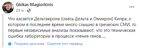"Первые независимые анализы показывают, что это техническая ошибка лаборатории, возникшая в процессе чтения генома", - написал у себя в Facebook доцент кафедры вирусологии Афинского национального университета имени Каподистрии в Греции и член экспертной комиссии Гикас Майоркини.