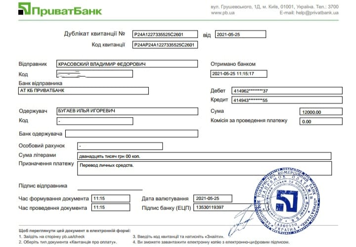 Также он опубликовал в соцсети выписку со счета, подтверждающую такой платеж с карты его умершего отца на счет некого Ильи Бугаева. Этот же документ активист передал правоохранителям.