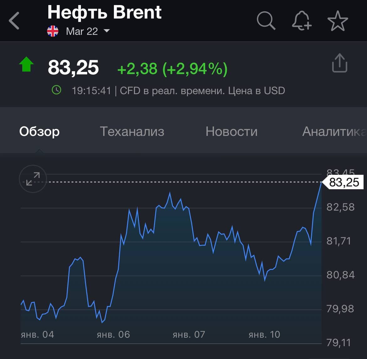 К 18:11 по Киеву стоимость фьючерса на нефть марки Brent с поставкой в марте 2022 года на лондонской бирже ICE выросла на 2,94% и достигла $83,25 за баррель. К 18:20 по Киеву Brent торговалась на уровне $83,3 за баррель (+3%).